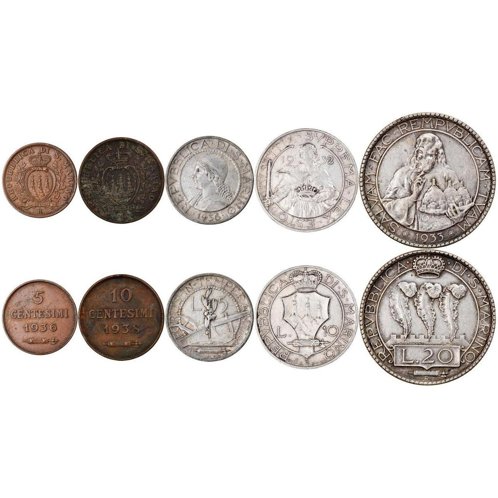 مجموعة من 5 عملات مصنوعة في هذه البلدان: سان مارينو (Repubblica di San Marino)، جمهورية سان مارينو.