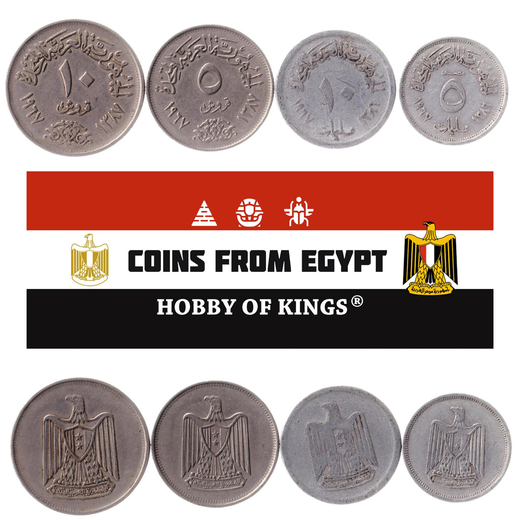Reverse lettering: الجمهورية العربية المتحدة مصر ٥ مليمات ١٣٨٦ ١٩٦٧، الجمهورية العربية المتحدة مصر ١٠ ١٣٨٦ مليمات ١٩٦٧، الجمهورية العربية المتحدة ٥ قروش ١٣٨٧ ١٩٦٧، الجمهورية العربية المتحدة ١٠ قروش ١٣٨٧ ١٩٦٧
