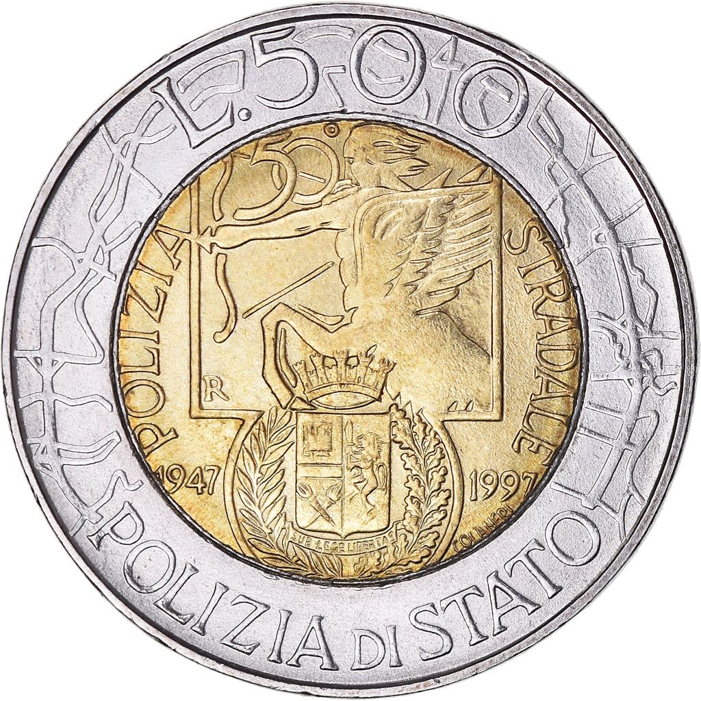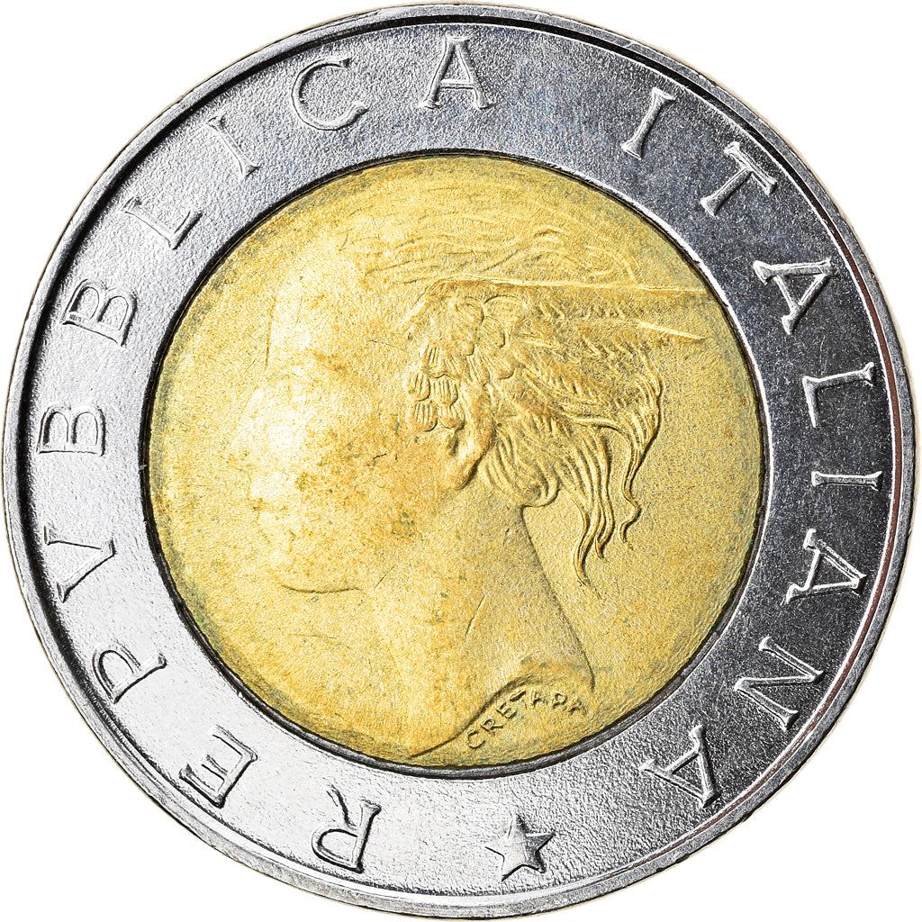 500 Lire mønt fra Italien (Repubblica Italiana, Italienske Republik). Mønten blev cirkuleret i 1997 og vælges tilfældigt. Forskellige grader fra God til Meget fin. Et foto er kun til reklameformål. Mønten kan have ridser, snavs eller skader fra oxidation.