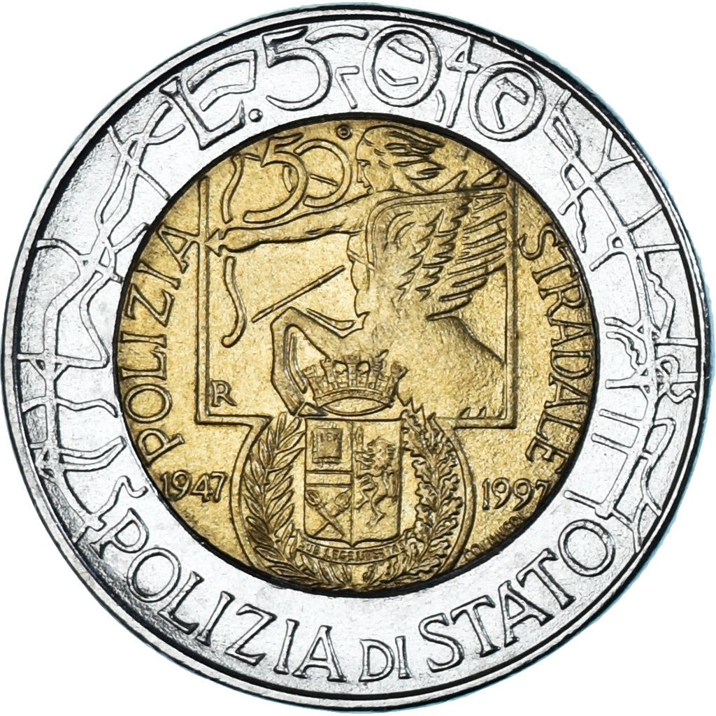 Omvendt tekst: L. 500 Polizia Stradale 501947-1997 Polizia Di Stato sub Lege Libertas