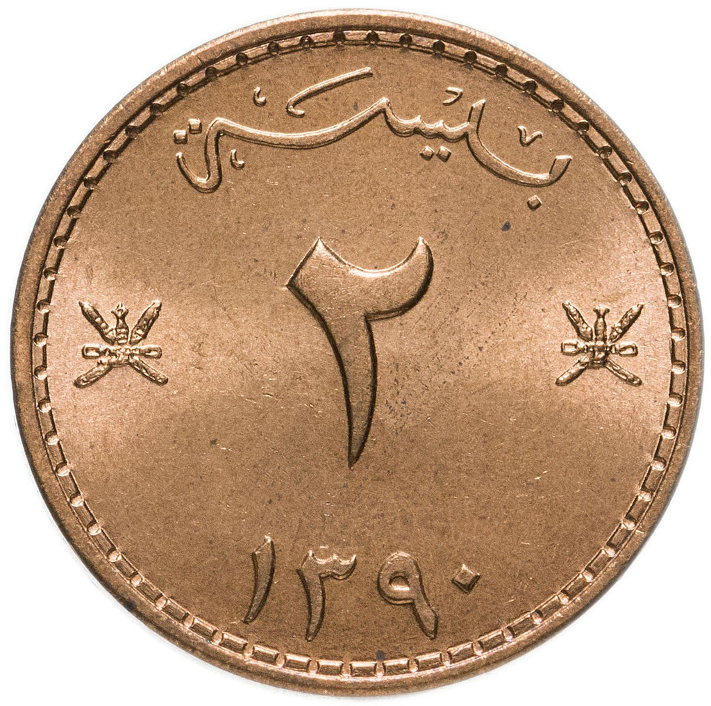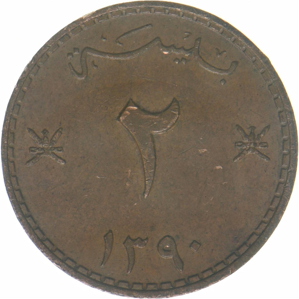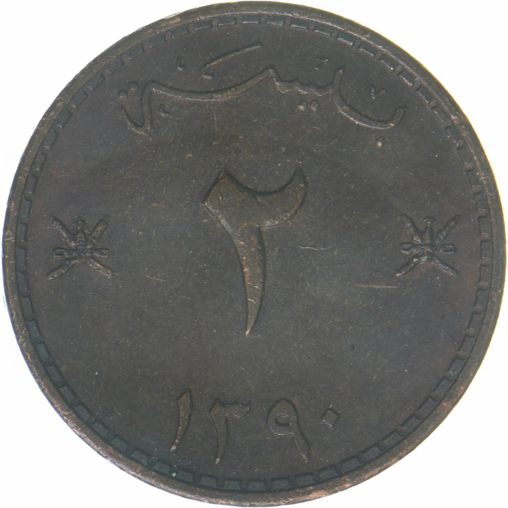 2 Baisa mønt fra Muscat og Oman (Sultanatet Muscat og Oman, سلطنة مسقط وعمان). Mønten blev cirkuleret i 1970 og vil blive udvalgt tilfældigt. Forskellige grader fra God til Meget fin. Et foto er kun til reklameformål. Mønten kan have ridser, snavs eller skader fra oxidation.