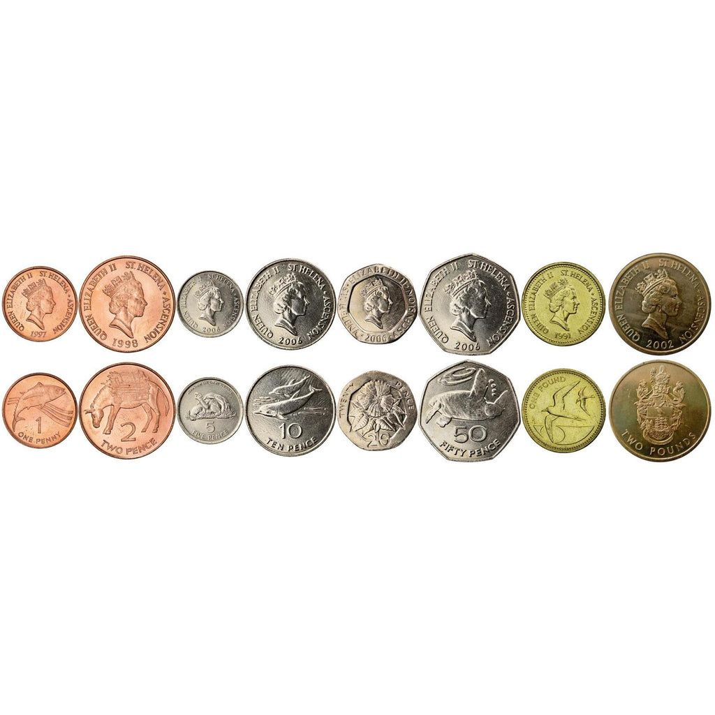 8-møntsæt lavet i disse lande: Saint Helena og Ascension, Saint Helena og Ascension (britiske oversøiske territorier).