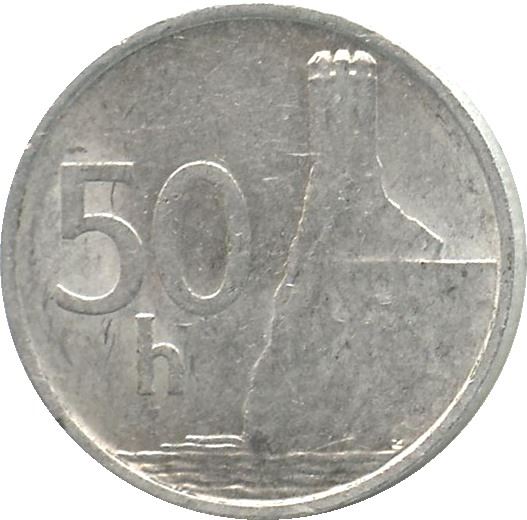 50 Halierov mønt fra Slovakiet (Slovenská republika, Slovak Republic). Mønten var i omløb 1993 - 1995 og vælges tilfældigt. Forskellige grader fra God til Meget fin. Foto er kun til reklameformål. Mønten kan have ridser, snavs eller skader fra oxidation.