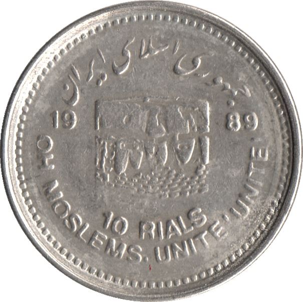 Forside bogstaver: جمُهورى اسلامى ايران 1989 10 RIALS ÅH MUSLIMER, FORÉN JER! FORÉN JER!