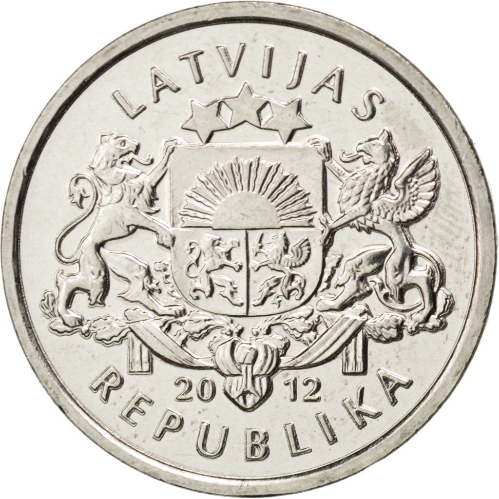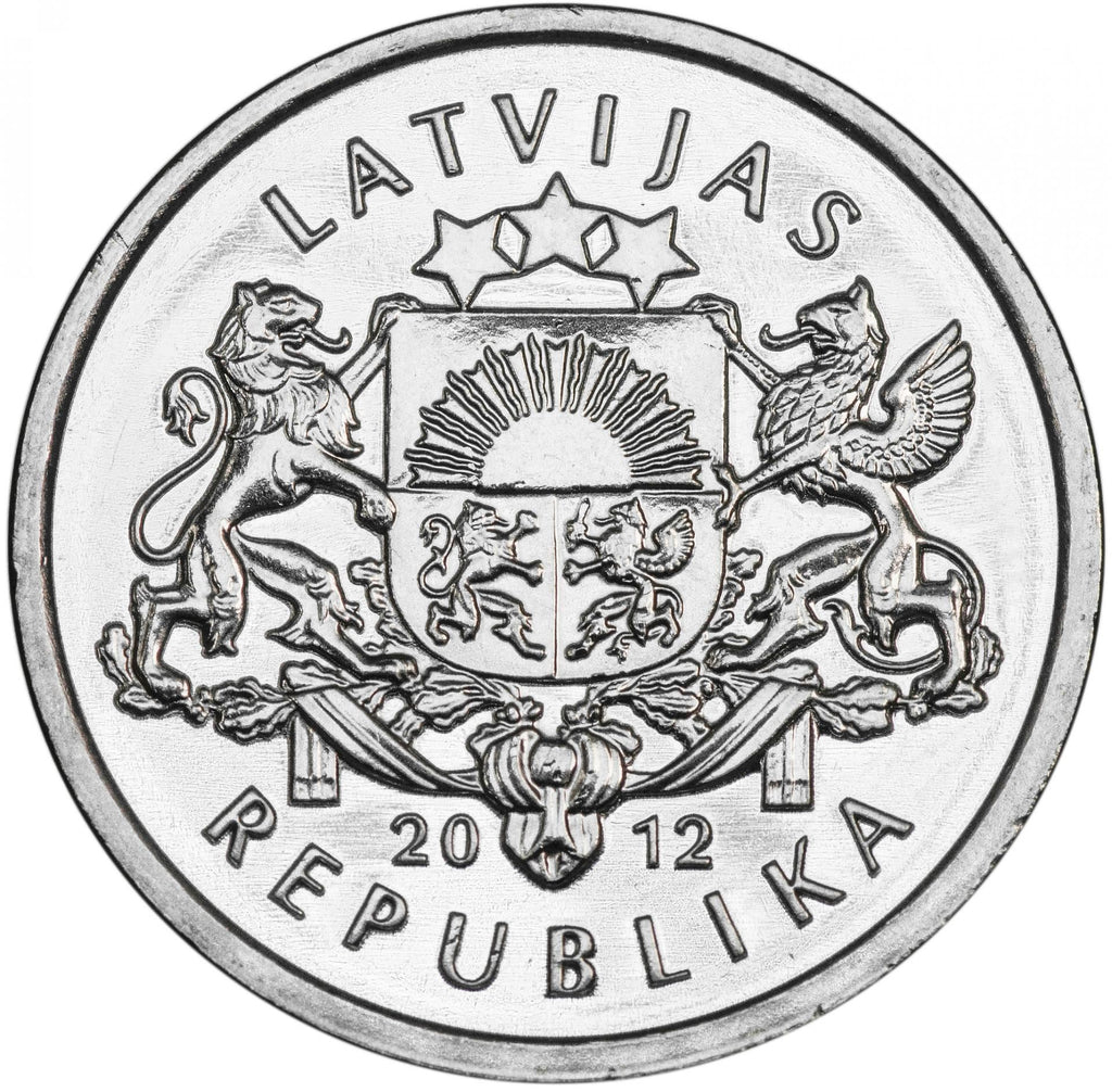 Vorderseite: Das große Wappen der Republik Lettland mit der Jahreszahl 2012 darunter ist in der Mitte platziert. Die Inschriften LATVIJAS und REPUBLIKA, jeweils halbkreisförmig angeordnet, befinden sich ober- bzw. unterhalb des zentralen Motivs.