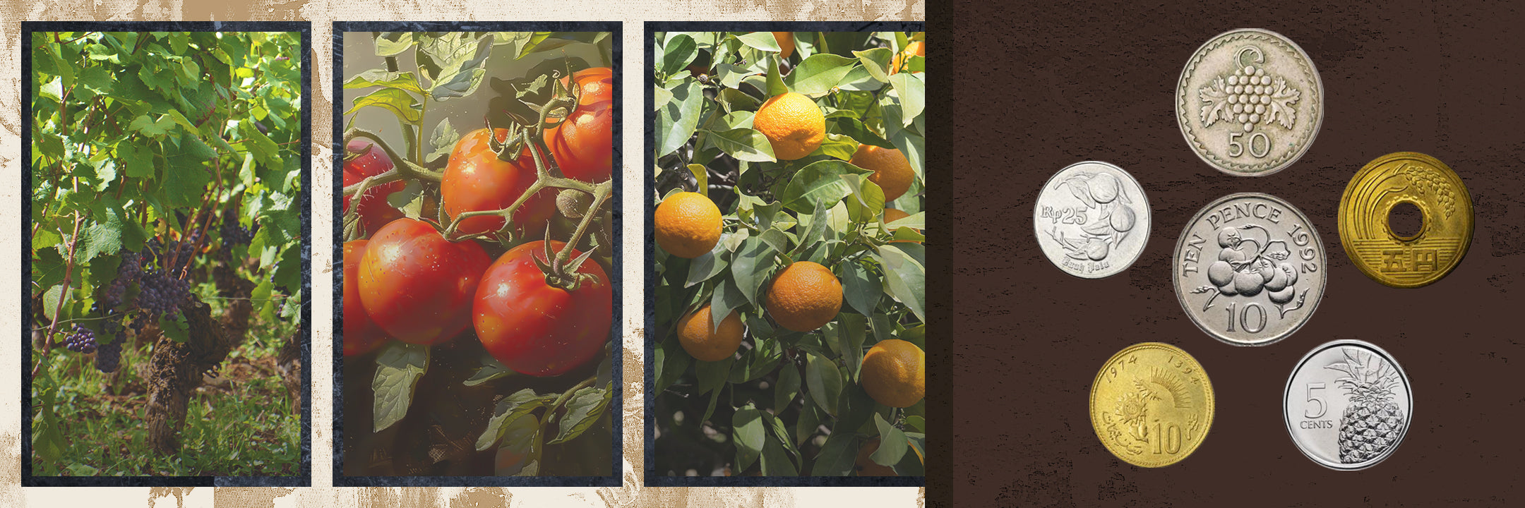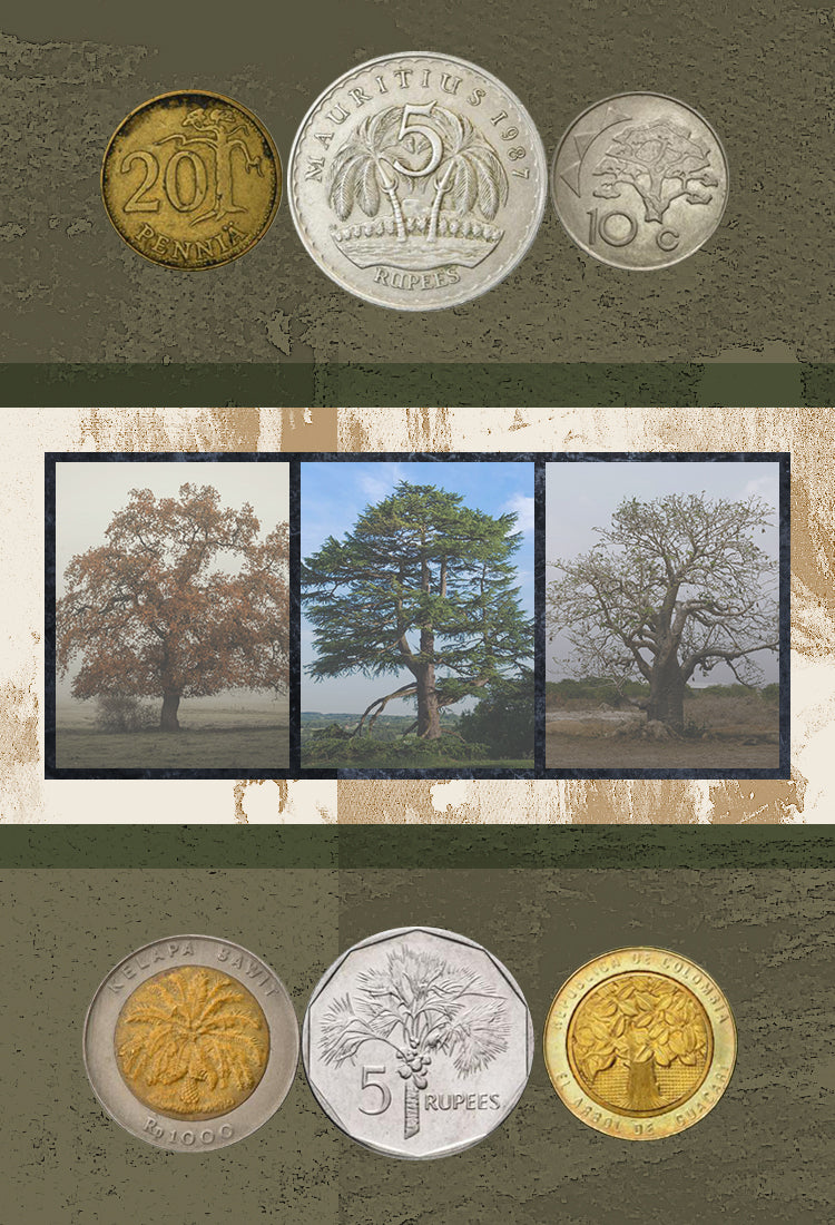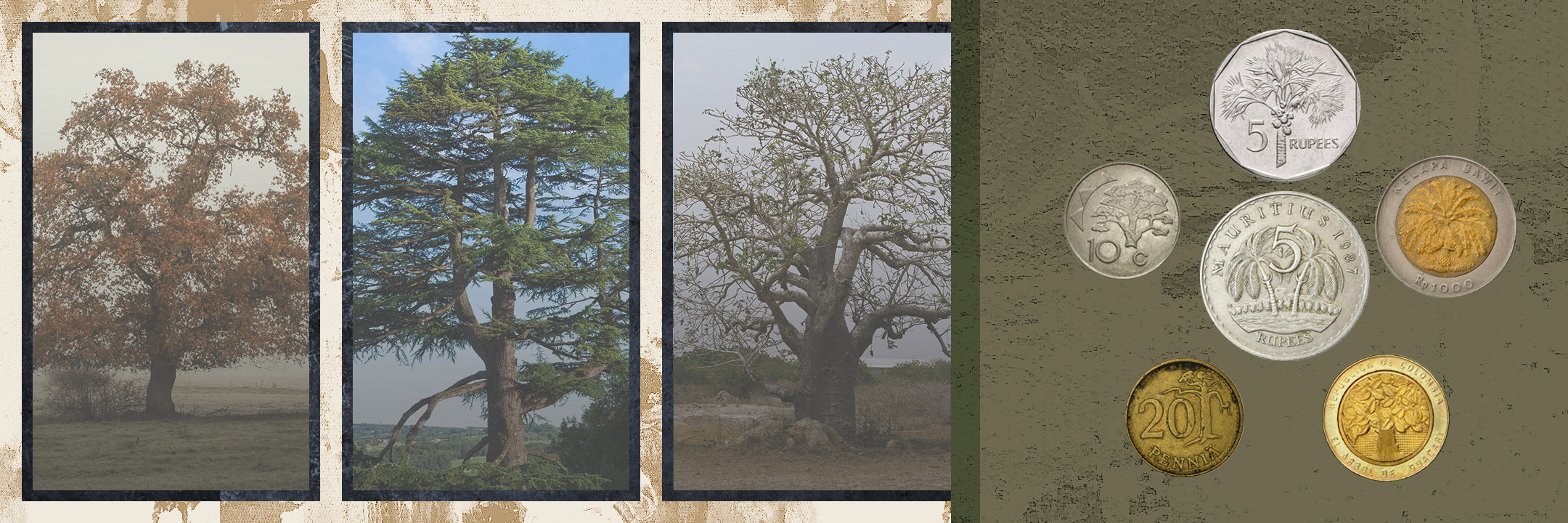 Los elementos comunes entre monedas, billetes y sellos postales incluyen denominaciones, años y representaciones de países o regiones específicas.