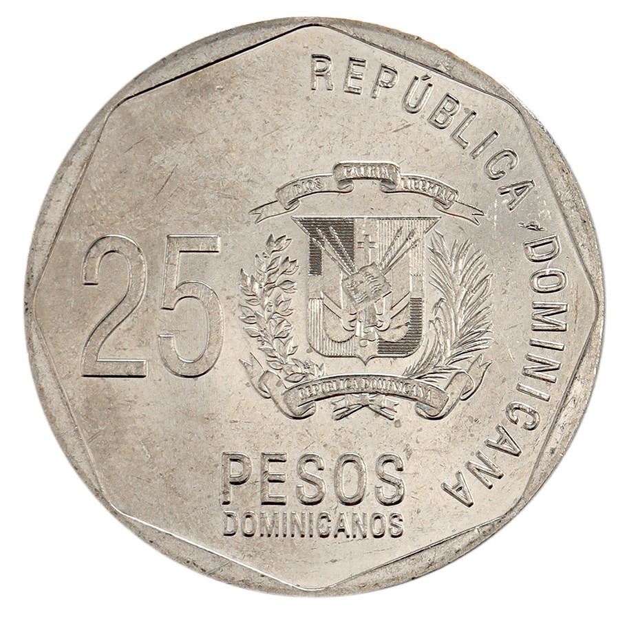Moneda de 25 Pesos Dominicanos de la República Dominicana (República Dominicana, Kiskéya). La moneda estuvo en circulación de 2017 a 2022 y será seleccionada al azar. Varias calidades desde Bueno hasta Muy fino. La foto es solo para fines publicitarios. La moneda puede tener rayones, suciedad o daños por oxidación.