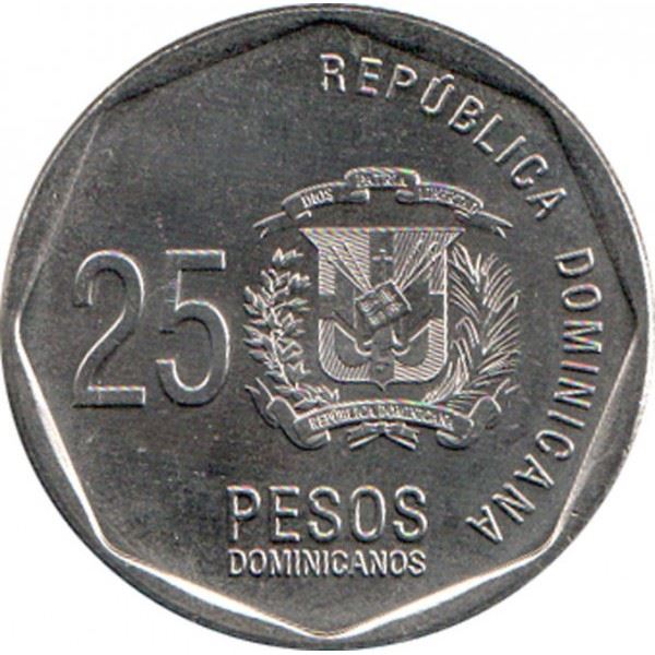 Letras anverso: República Dominicana Dios Patria Libertad 25 República Dominicana Pesos Dominicanos