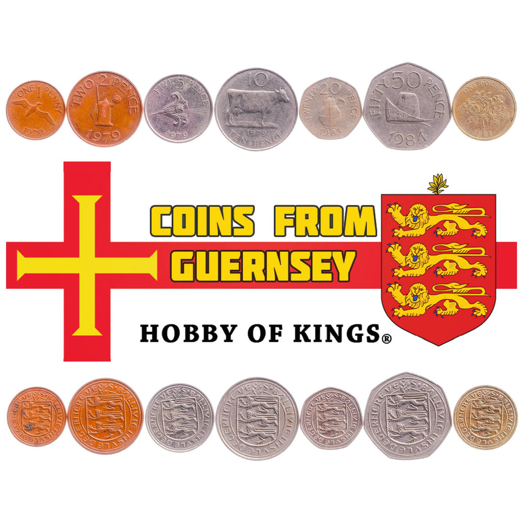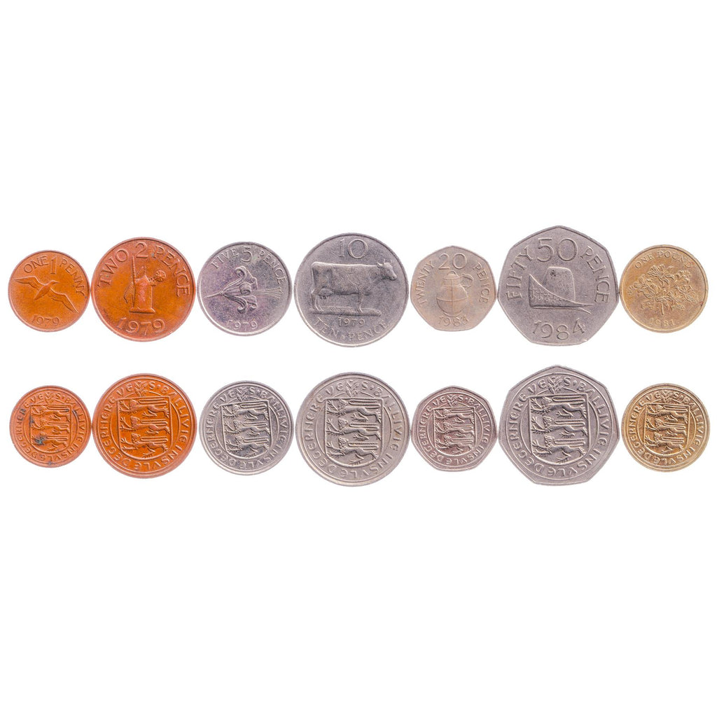 Conjunto de 7 monedas hechas en estos países: Guernsey (Guernesey), Giernési.