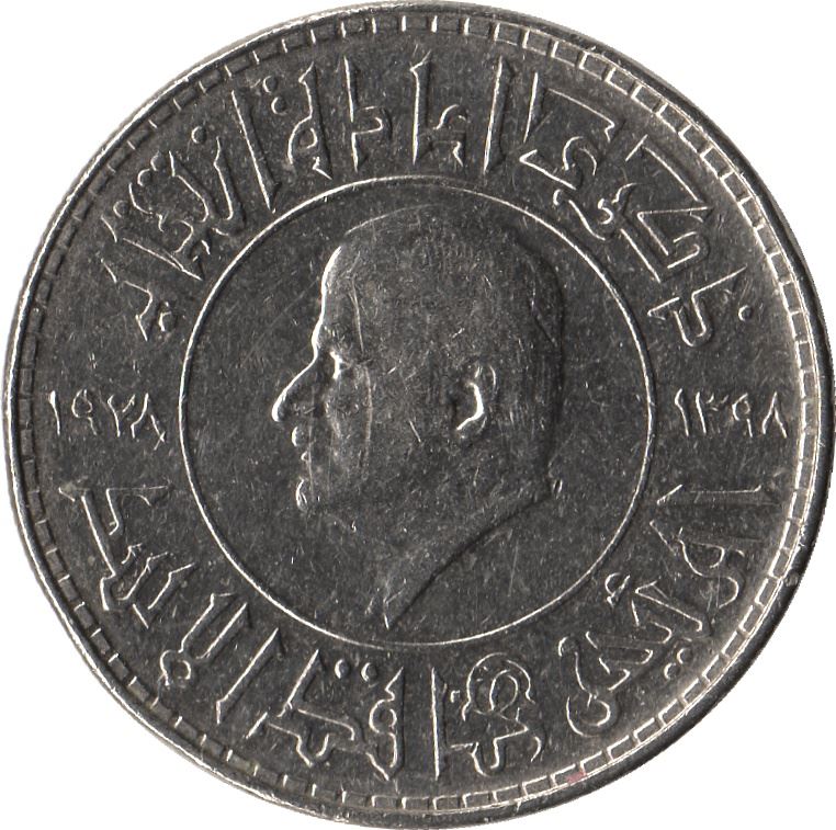 Moneda de 1 Lira de Siria (República Árabe Siria, ٱلْجُمْهُورِيَّةُ ٱلْعَرَبِيَّةُ ٱلسُّورِيَّةُ). La moneda fue circulada en 1978 y será seleccionada al azar. Diversas calidades desde Bueno hasta Muy fino. La foto es solo para fines publicitarios. La moneda puede tener rayones, suciedad o daños por oxidación.