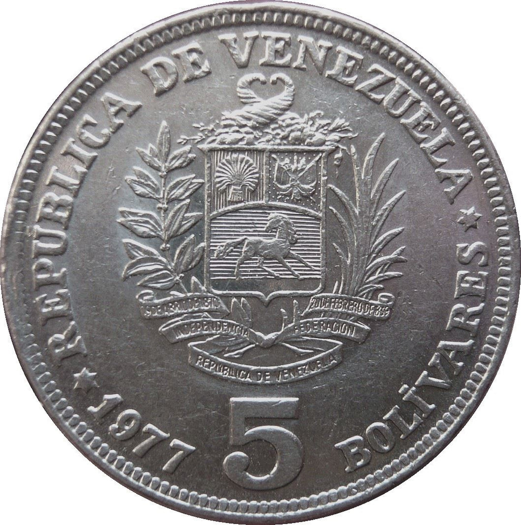 Inscription à l'avers : ★ REPÚBLICA DE VENEZUELA ★ 1977 5 BOLIVARES