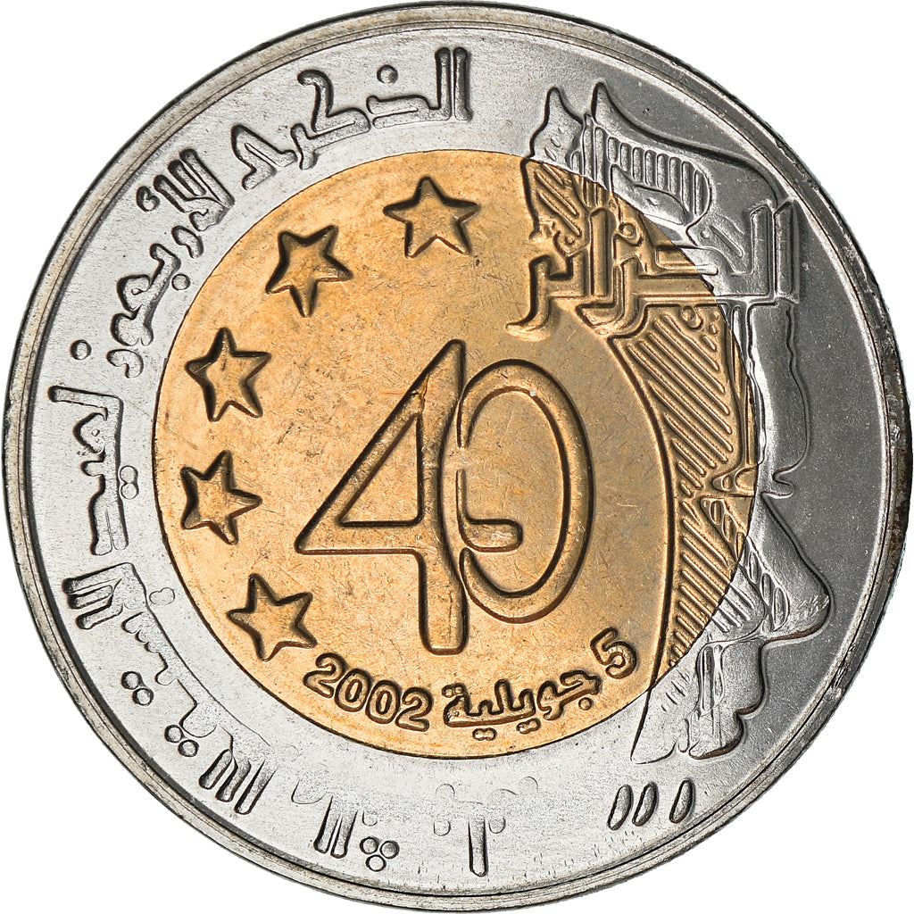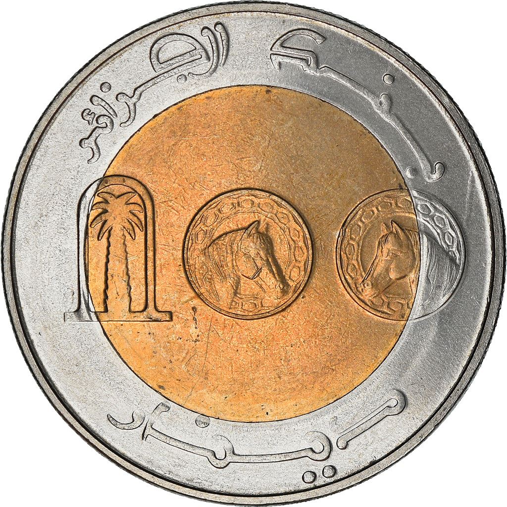 מטבע 100 דינרים מאלג'יריה (הרפובליקה הדמוקרטית העממית של אלג'יריה, الجمهورية الجزائرية الديمقراطية الشعبية). המטבע הונפק בשנת 2002 וייבחר באקראי. דרגות שונות מטוב ועד טוב מאוד. התמונה למטרות פרסום בלבד. המטבע עלול להכיל שריטות, לכלוך או נזק מחמצון.