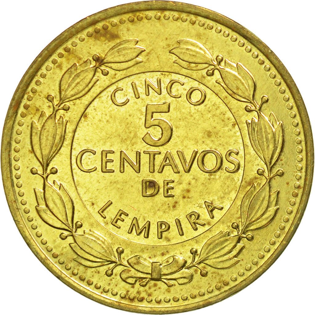 מטבע 5 סנטבוס מהונדורס (רפובליקה דה הונדורס, רפובליקה דה הונדורס). המטבע הונפק בין השנים 1993 - 1994 וייבחר באקראי. דרגות שונות מ"טוב" ועד "טוב מאוד". התמונה למטרות פרסום בלבד. המטבע עלול להכיל שריטות, לכלוך או נזק מחמצון.