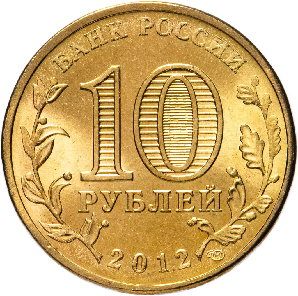 חזית: במרכז הדיסק - ציון הערך הנקוב של המטבע "10 РУБЛЕЙ" (10 רובלים). בתוך הספרה "0" - תמונות נסתרות של הספרה "10" ושל הכתובת "РУБ" (RUB) הנראות לסירוגין בשינוי זווית הראייה. לאורך השפה - כתובות מעגליות, למעלה: "БАНК РОССИИ" (בנק רוסיה), למטה - התאריך: "2012", משמאל - דמות מעוצבת של ענף זית, מימין - של אלון.