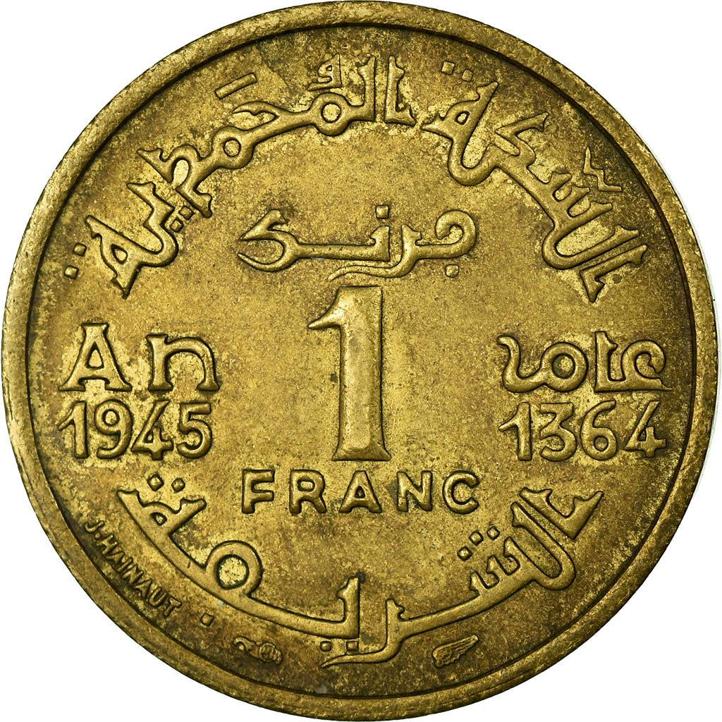 मोरक्को का 1 फ्रैंक सिक्का (Tageldit n Lmeɣrib, al-Mamlakah al-Maghribiyah)। यह सिक्का 1945 में प्रचलित था और यादृच्छिक रूप से चुना जाएगा। विभिन्न ग्रेड अच्छे से लेकर बहुत अच्छे तक। फोटो केवल विज्ञापन के उद्देश्य से है। सिक्के पर खरोंच, गंदगी, या ऑक्सीकरण से क्षति हो सकती है।