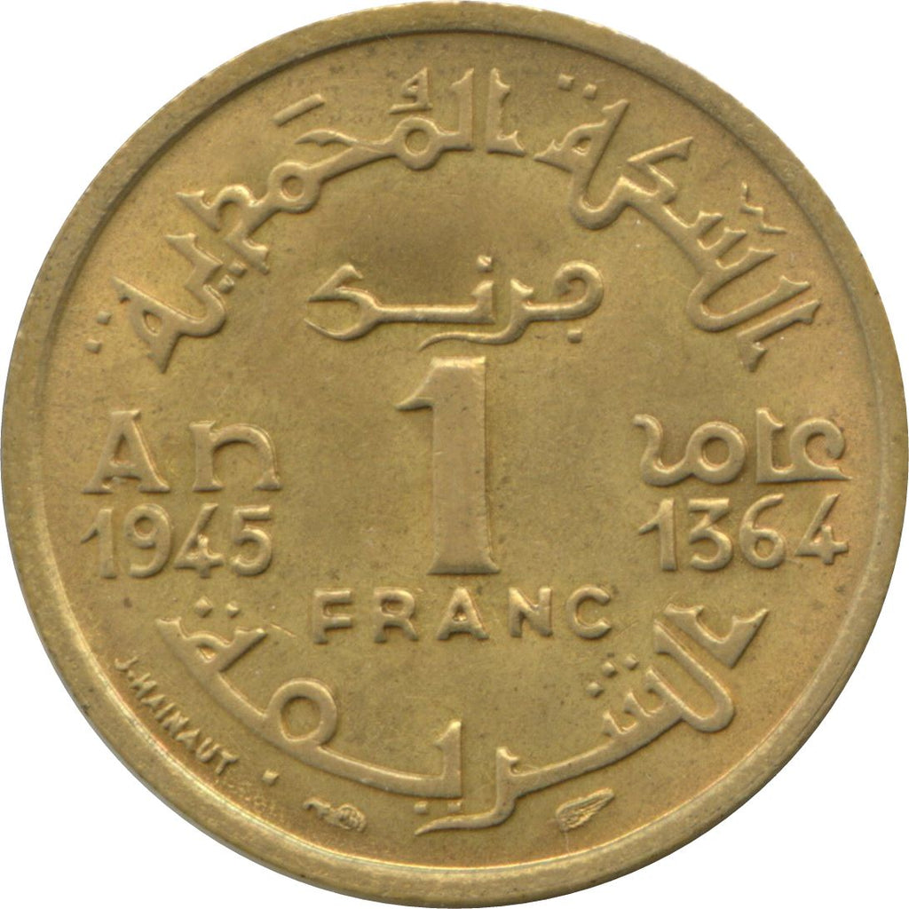 रिवर्स अक्षर: السكة المحمدية فرنك 1 FRANC AN 1945 1364 عام الشريفة J.HAINAUT
