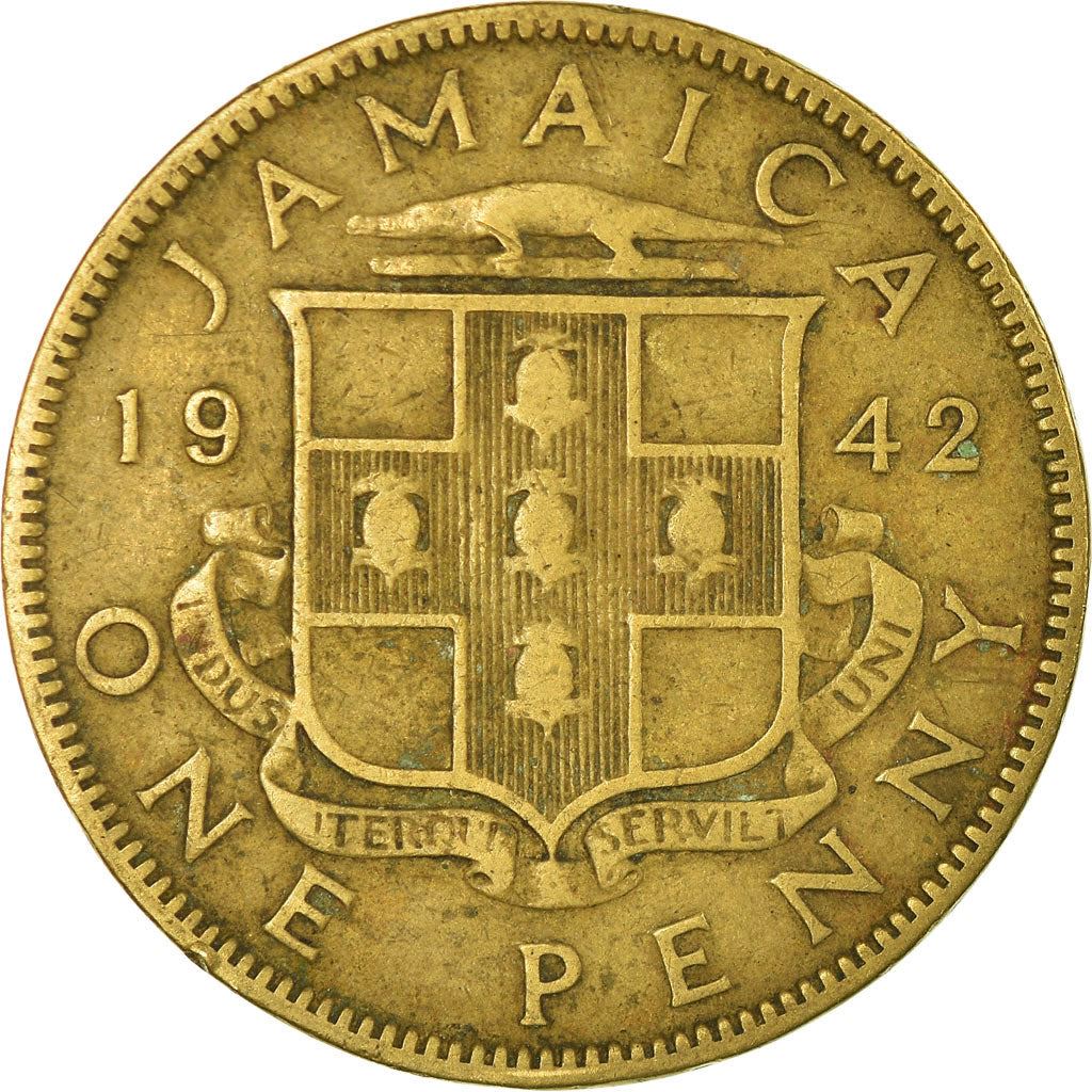 Scritta rovesciata: Jamaica One Penny 1942 Indus Uterque Serviet Uni