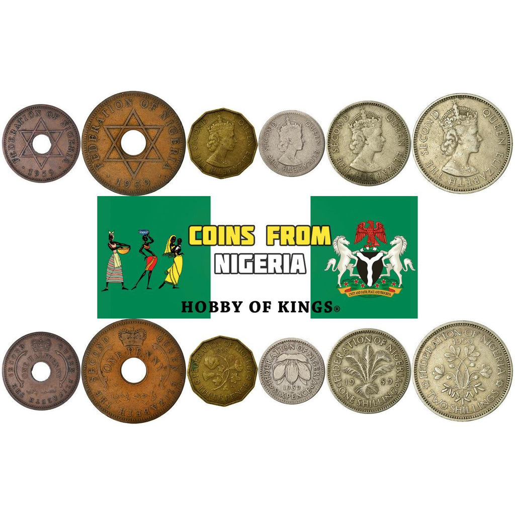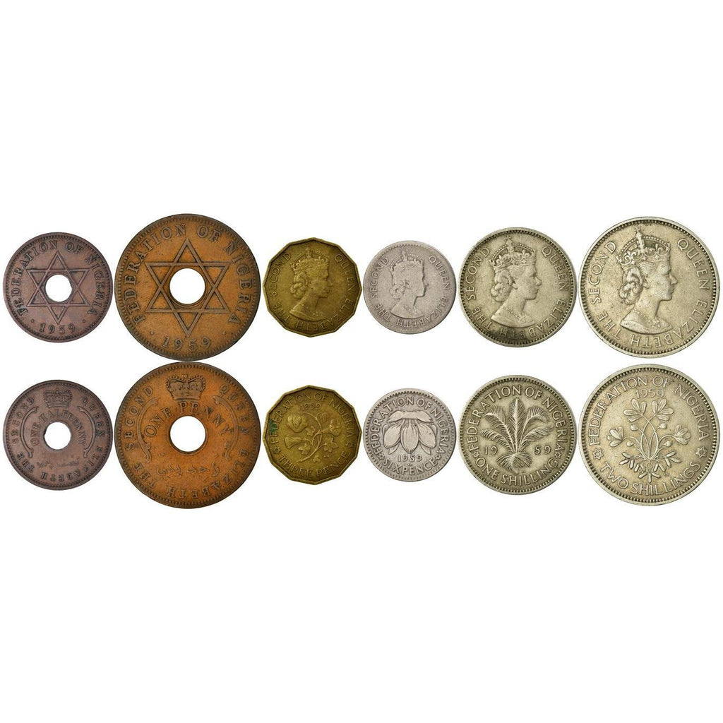 Scritta sul rovescio: Federation Of Nigeria 1959, Federation Of Nigeria 1959 P.V. Three Pence, Federation Of Nigeria 1959 Hp Sixpence, Federation Of Nigeria 1959 Hp One Shilling, Federation Of Nigeria 1959 P.V. Two Shillings