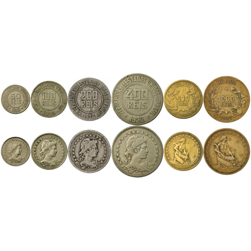 앞면 문자: Republica Dos Estados Unidos Do Brasil50Réis* 1935 *, Republica Dos Estados Unidos Do Brasil100Réis* 1935 *, Republica Dos Estados Unidos Do Brasil 200 Réis*1932*, Republica Dos Estados Unidos Do Brasil400Réis* 1922 *, Brasil500Réis1928, Brasil *1000 Réis 1927