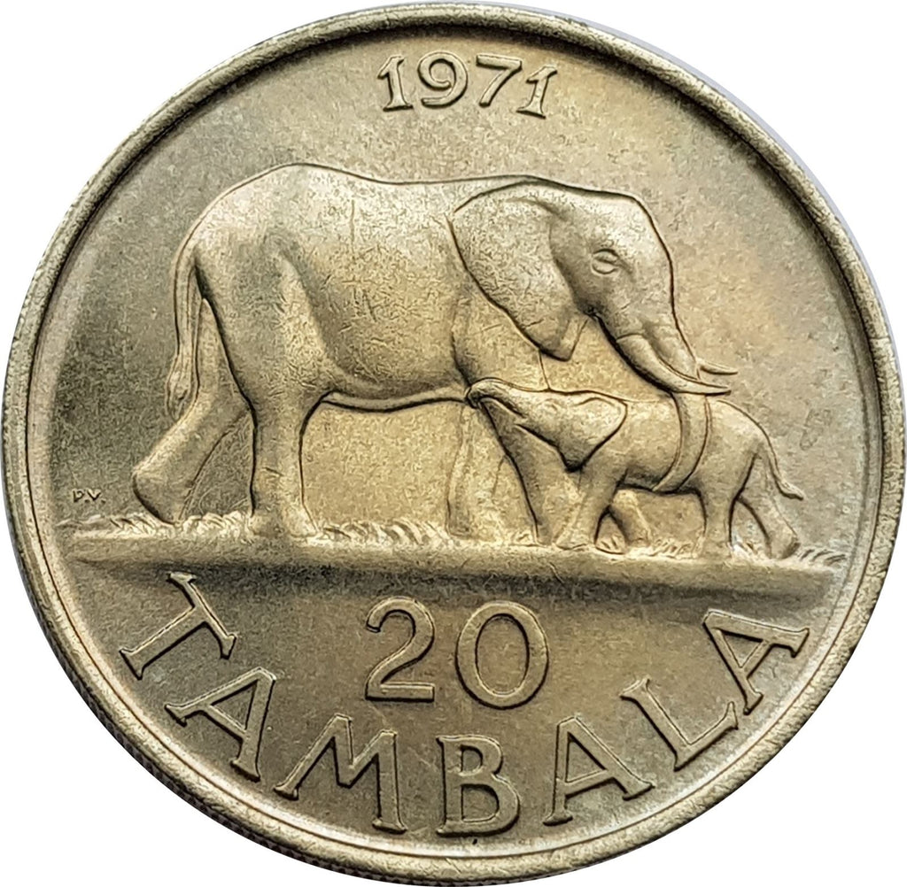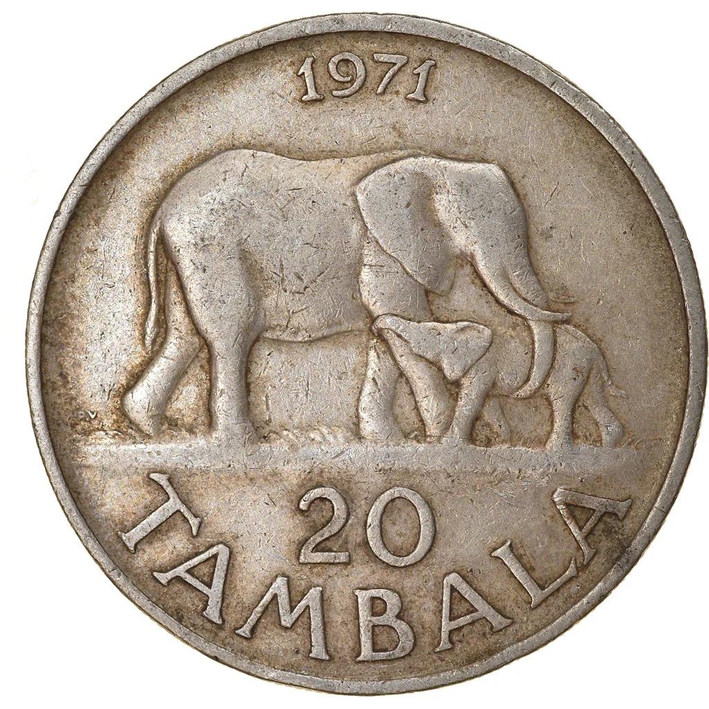 말라위(말라위 공화국, Dziko la Malaŵi)의 20 탐발라 동전. 이 동전은 1971년부터 1985년까지 유통되었으며 무작위로 선택됩니다. 상태는 양호부터 매우 양호까지 다양합니다. 사진은 광고용입니다. 동전에는 긁힘, 오염 또는 산화로 인한 손상이 있을 수 있습니다.