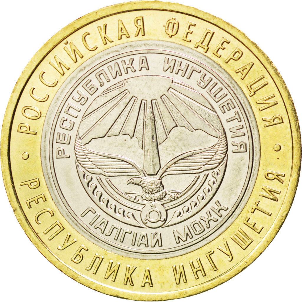 역면: 이 동전의 뒷면에는 잉구셰티야 공화국 문장이 원판 위에 배치되어 있습니다. 원주를 따라 글자가 새겨져 있는데, 상단에는 «Российская Федерация»(러시아 연방), 하단에는 «Республика Ингушетия»(잉구셰티야 공화국)라고 적혀 있습니다.