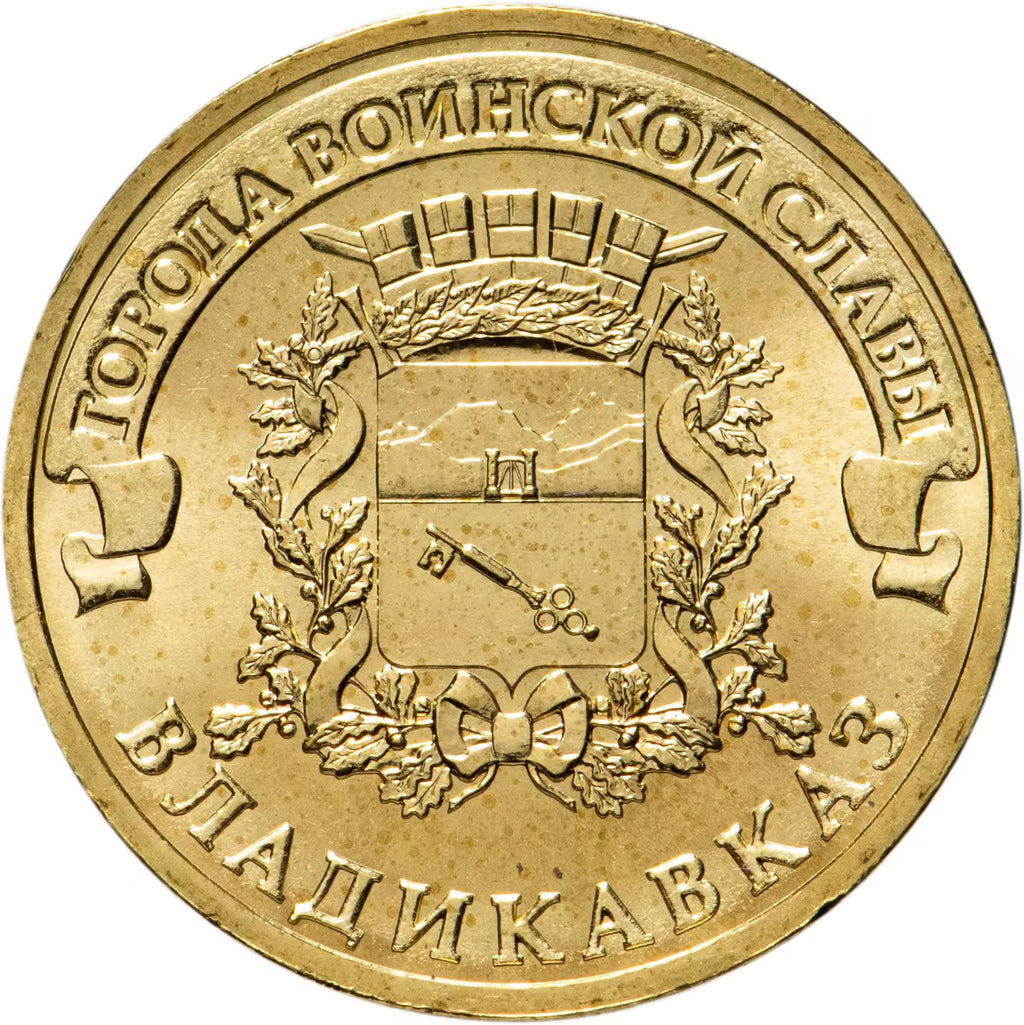 역방향: 블라디카프카즈 시 문장, 그 위에 리본에 반원형으로 새겨진 문구: "ГОРОДА ВОИНСКОЙ СЛАВЫ" (무공의 도시들), 아래에는 가장자리를 따라 새겨진 문구: "ВЛАДИКАВКАЗ" (블라디카프카즈).