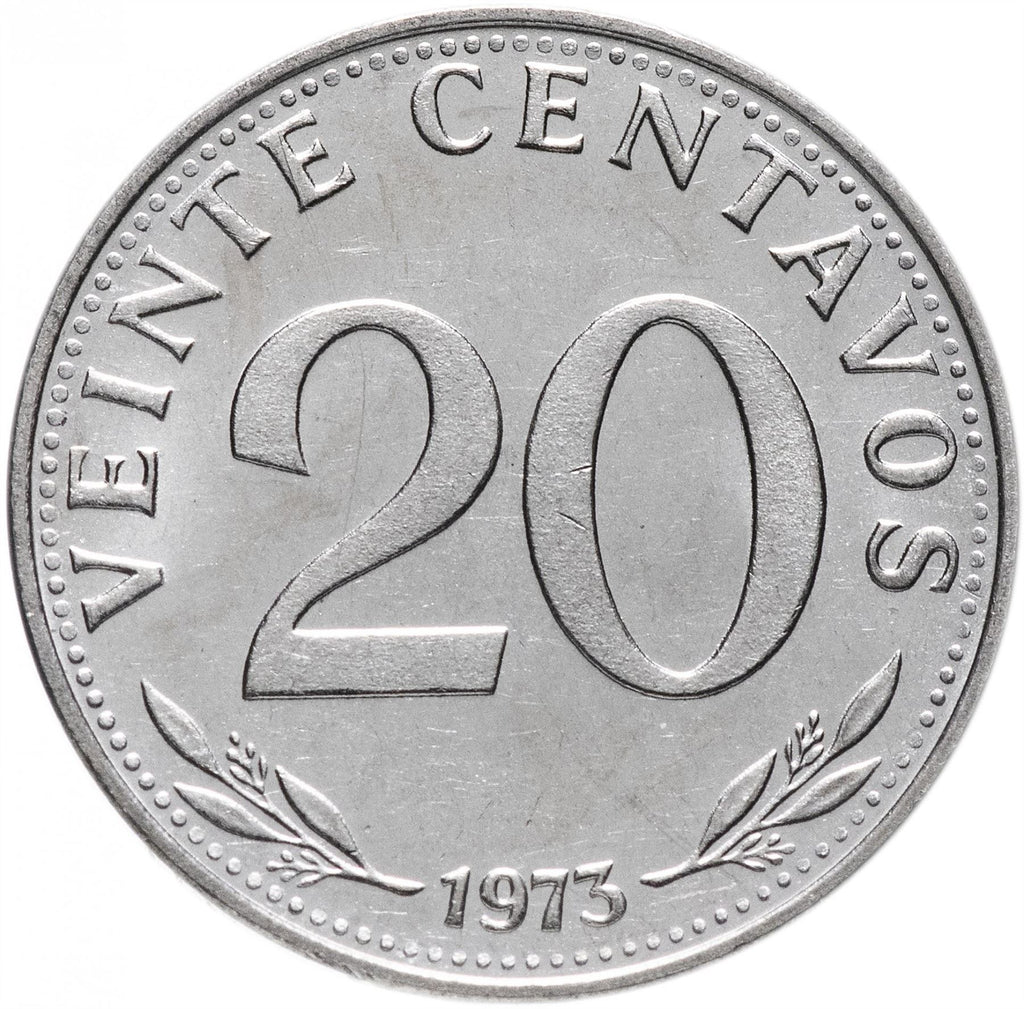 Atvirkštinis užrašas: VEINTE CENTAVOS 20 1973