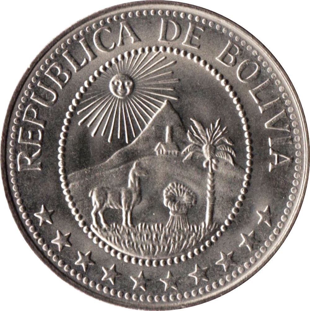 20 centų moneta iš Bolivijos (Bolivijos daugiatautė valstybė, Estado Plurinacional de Bolivia). Moneta cirkuliavo 1965 - 1973 metais ir bus parinkta atsitiktinai. Įvairūs būklės laipsniai nuo geros iki labai geros. Nuotrauka skirta tik reklamos tikslams. Monetoje gali būti įbrėžimų, nešvarumų ar oksidacijos pažeidimų.