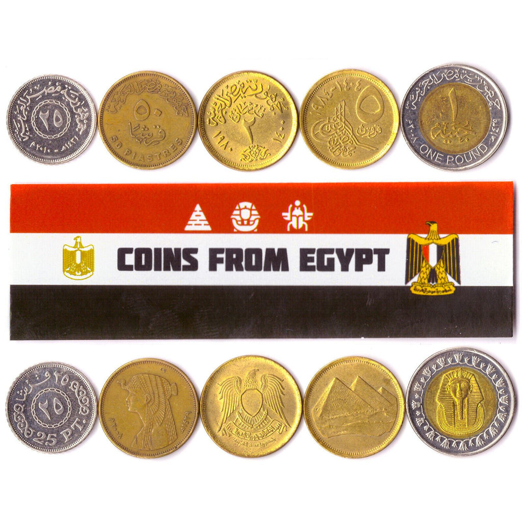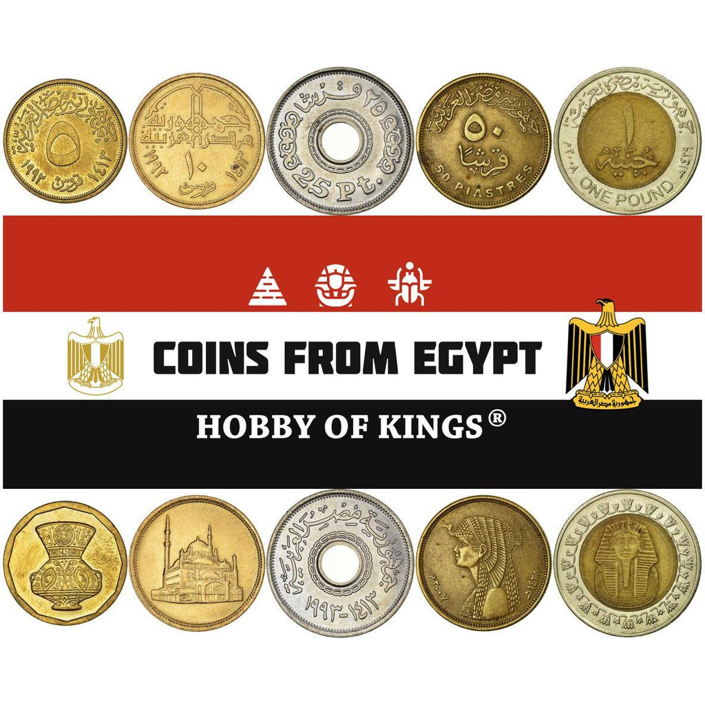 1 Mišrios monetos iš Egipto (Egipto Arabų Respublika, جمهورية مصر العربية). Skirtingos Egipto monetos atsitiktinai parinktos iš šių laikotarpių: Egipto Arabų Respublika 1971–dabar (1992 - 2025).
