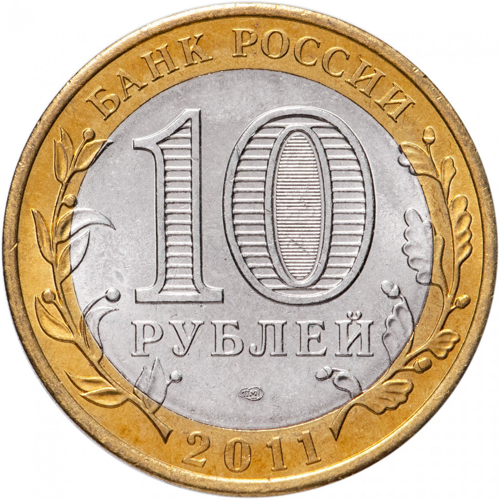 Priekinis vaizdas: Disko centre – monetos nominalo žymėjimas „10 Рублей“ (10 rubliai). Skaičiaus „0“ viduje – paslėpti skaičiaus „10“ ir užrašo „Руб“ vaizdai, matomi keičiant žiūrėjimo kampą. Disko apatinėje dalyje – monetų kalyklos ženklas. Žiedo viršutinėje dalyje – užrašas palei kraštą: „Банк России“ (Rusijos bankas), apatinėje – leidimo metai „2011“, kairėje ir dešinėje – stilizuotos augalų šakelės, pereinančios į diską.