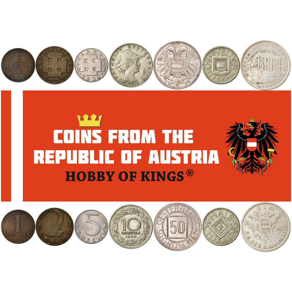 Het product bevat deze nominale waarden: 1 Groschen, 2 Groschen, 5 Groschen, 10 Groschen, 50 Groschen, 1/2 Schilling, 1 Schilling.