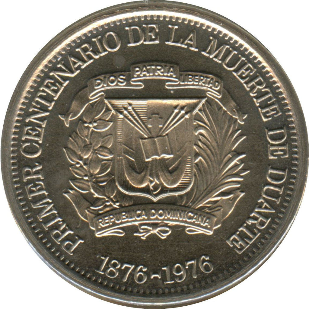 25 Centavos Juan Pablo Duarte mynt fra Den dominikanske republikk (República Dominicana). Mynten ble sirkulert i 1976 og vil bli valgt tilfeldig. Ulike grader fra God til Meget fin. Et bilde er kun for reklameformål. Mynten kan ha riper, smuss eller skade fra oksidasjon.