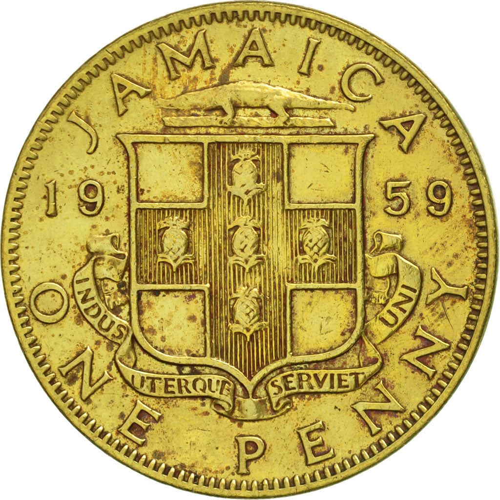 1 Penny mynt fra Jamaica (Jumieka). Mynten var i omløp 1953 - 1963 og vil bli valgt tilfeldig. Ulike grader fra God til Meget fin. Et bilde er kun for reklameformål. Mynten kan ha riper, smuss eller skade fra oksidasjon.