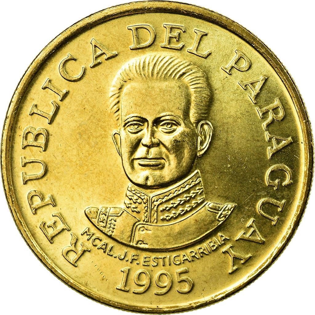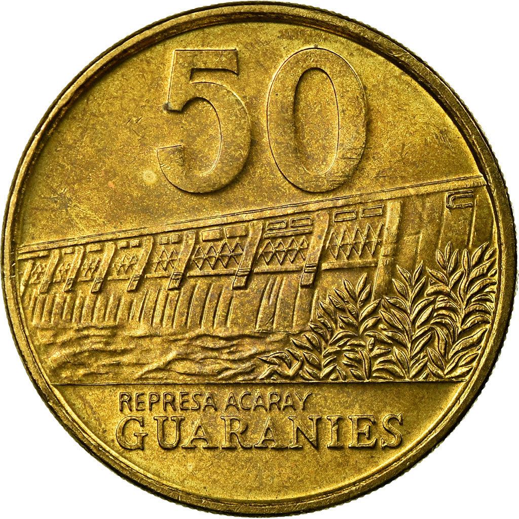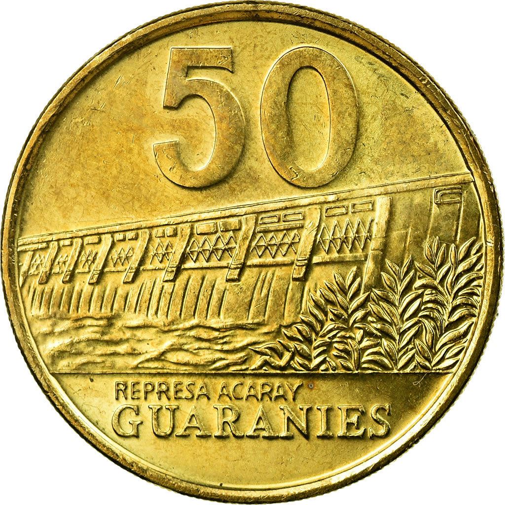 50 Guaranies mynt fra Paraguay (Paraguái Tavakuairetã, República del Paraguay). Mynten var i omløp 1995 - 2005 og vil bli valgt tilfeldig. Ulike grader fra God til Meget fin. Et bilde er kun for reklameformål. Mynten kan ha riper, smuss eller skade fra oksidasjon.
