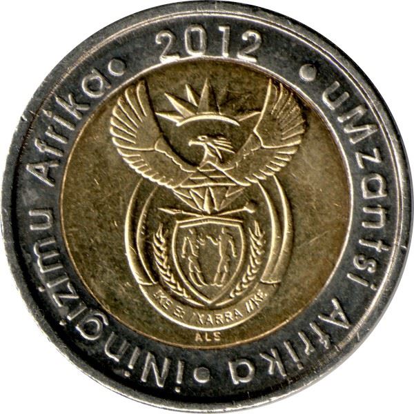 5 Rand mynt fra Sør-Afrika (Republikken Sør-Afrika, Republiek van Suid-Afrika). Mynten ble i omløp fra 2012 - 2022 og vil bli valgt tilfeldig. Ulike grader fra God til Meget fin. Et bilde er kun for reklameformål. Mynten kan ha riper, smuss eller skade fra oksidasjon.