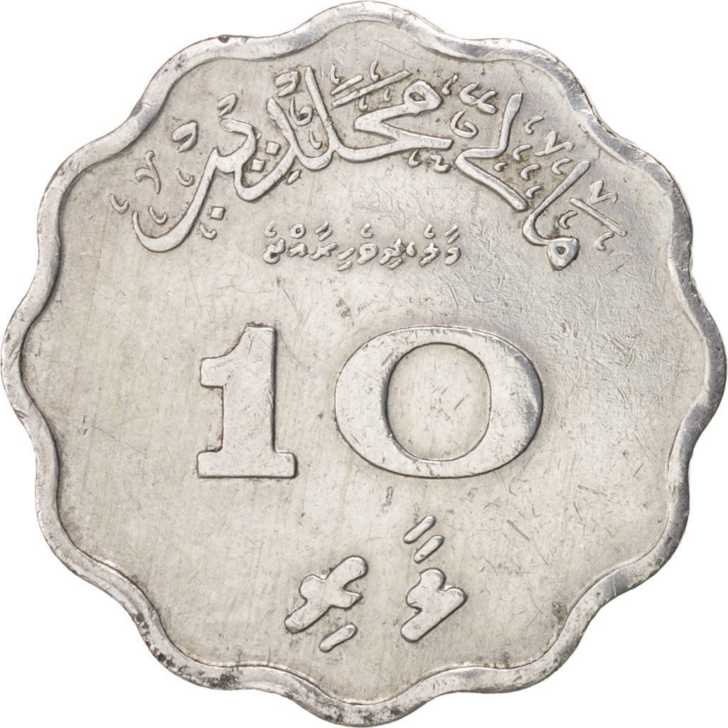Moneta 10 Laari z Malediwów (ދިވެހިރާއްޖޭގެ ޖުމްހޫރިއްޔާ). Moneta była w obiegu w latach 1960 - 1979 i zostanie wybrana losowo. Różne stany zachowania od Dobrego do Bardzo dobrego. Zdjęcie ma charakter reklamowy. Moneta może mieć rysy, zabrudzenia lub uszkodzenia spowodowane oksydacją.