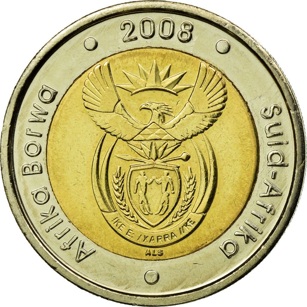 Moneta 5 Rand z Republiki Południowej Afryki (Republic of South Africa, Republiek van Suid-Afrika). Moneta była w obiegu w 2008 roku i zostanie wybrana losowo. Różne stany zachowania od Dobrego do Bardzo dobrego. Zdjęcie ma charakter wyłącznie reklamowy. Moneta może mieć rysy, zabrudzenia lub uszkodzenia spowodowane utlenianiem.