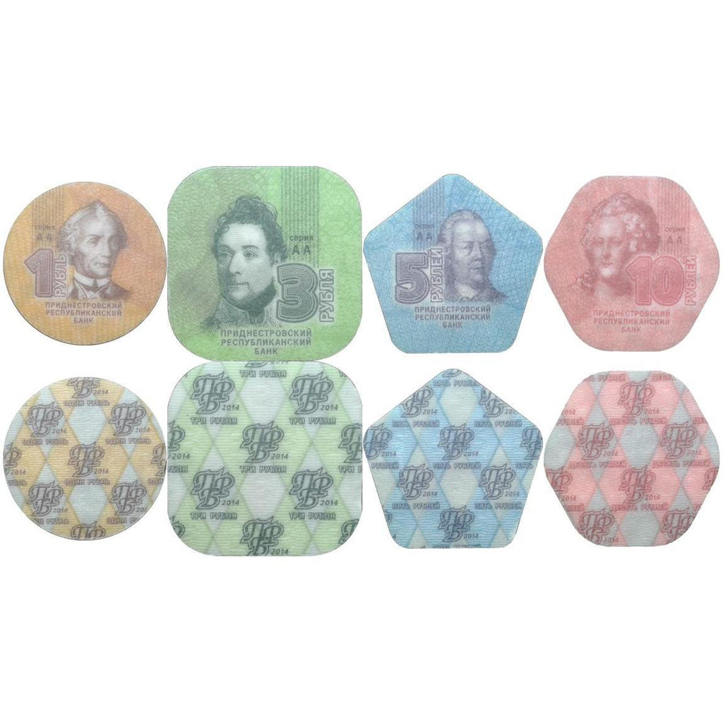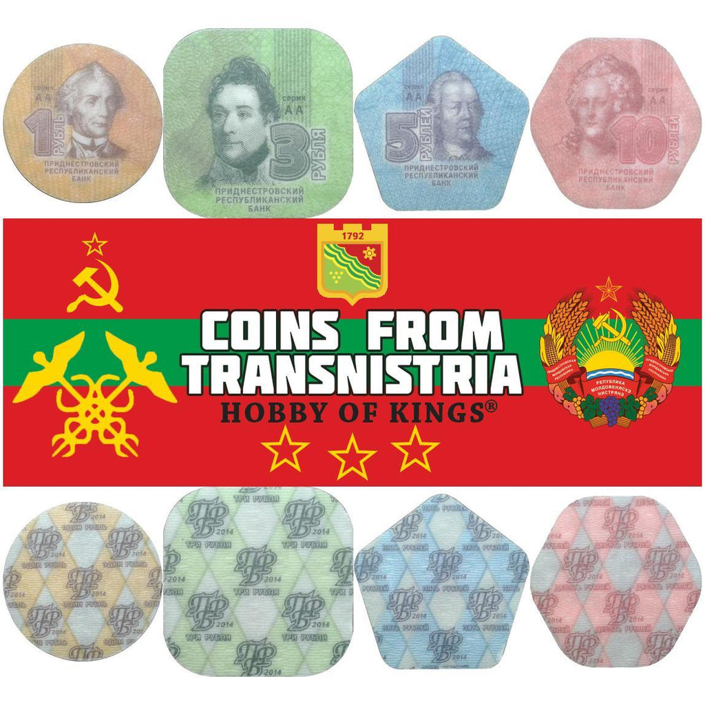 Tłumaczenie rewersu: Transnistriański Bank Republikański 2014 Jeden Rubel, Transnistriański Bank Republikański Trzy Ruble, TRB (Transnistriański Bank Republikański) Pięć Rubli, Transnistriański Bank Republikański Dziesięć Rubli