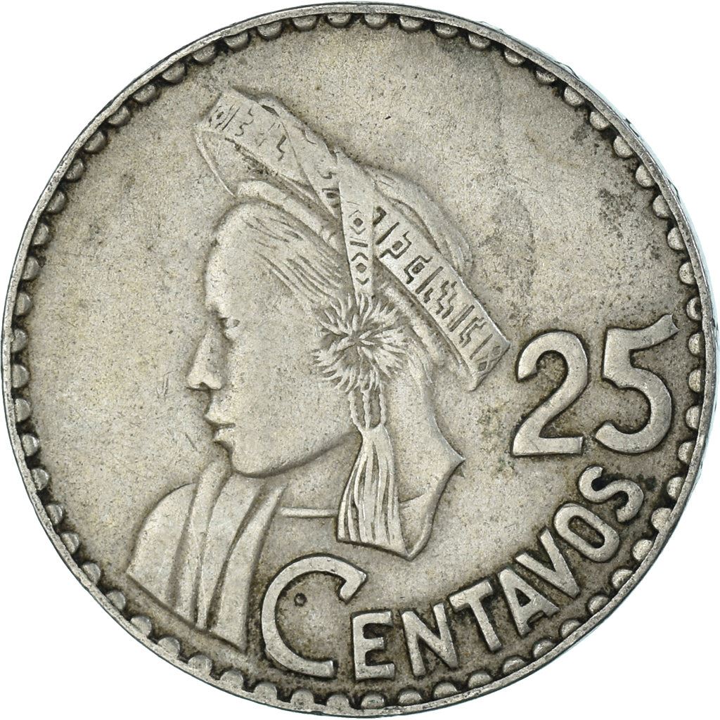 25 Centavos coin from Guatemala (República de Guatemala, República de Guatemala). The coin was circulated in 1965 - 1966 and will be picked randomly. Various grades from Good to Very fine. A photo is for advertising purposes only. The coin may have scratches, dirt, or damage from oxidation.