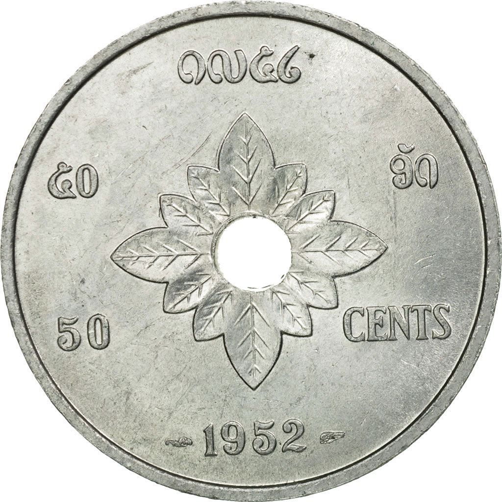 50 Cents coin from Laos (Sathalanalat Paxathipatai Paxaxon Lao, ສາທາລະນະລັດ ປະຊາທິປະໄຕ ປະຊາຊົນລາວ). The coin was circulated in 1952 and will be picked randomly. Various grades from Good to Very fine. A photo is for advertising purposes only. The coin may have scratches, dirt, or damage from oxidation.