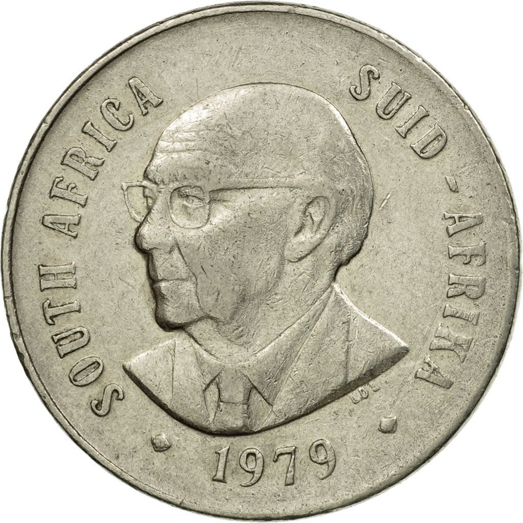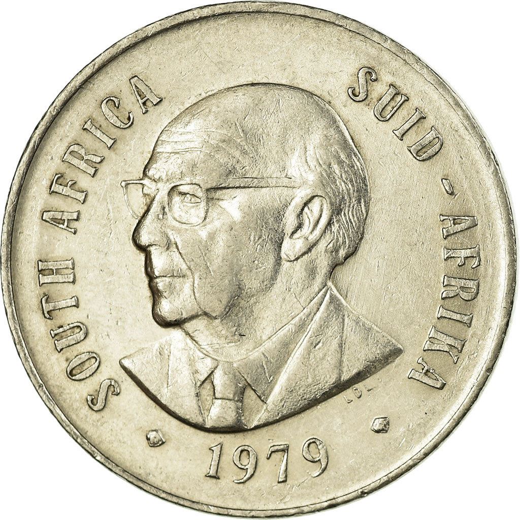 50 Cents coin from South Africa (Republic of South Africa, Republiek van Suid-Afrika). The coin was circulated in 1979 and will be picked randomly. Various grades from Good to Very fine. A photo is for advertising purposes only. The coin may have scratches, dirt, or damage from oxidation.