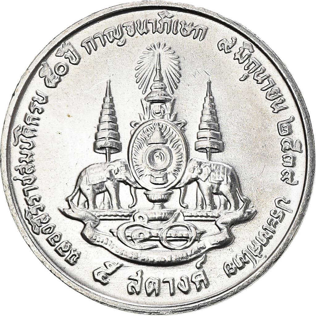 Reverse: The Royal Emblem Of Golden Jubilee Ceremony: Crowned Privy Seal Flanked By Two Elephants Facing Toward The Center, Each Covered By Seven-Tiered Chhatra Parasols, With Thai Number '50' And Mottos On Ribbon Below.