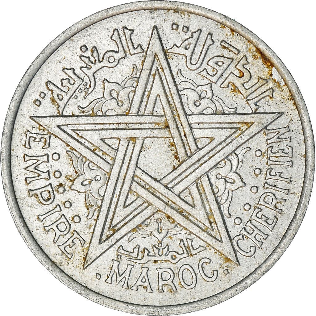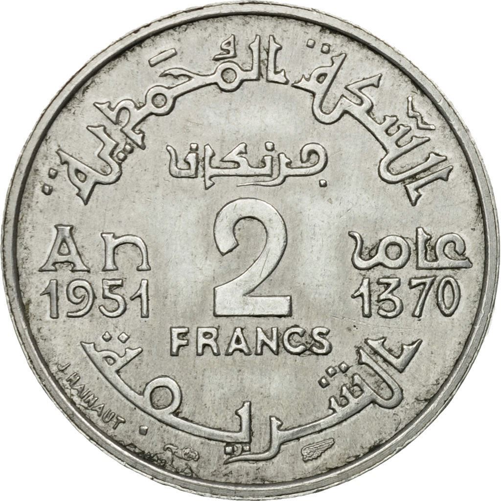 Moeda de 2 Francos de Marrocos (Tageldit n Lmeɣrib, al-Mamlakah al-Maghribiyah). A moeda foi circulada em 1951 e será escolhida aleatoriamente. Vários estados de conservação, de Bom a Muito fino. A foto serve apenas para fins publicitários. A moeda pode apresentar riscos, sujidade ou danos devido à oxidação.