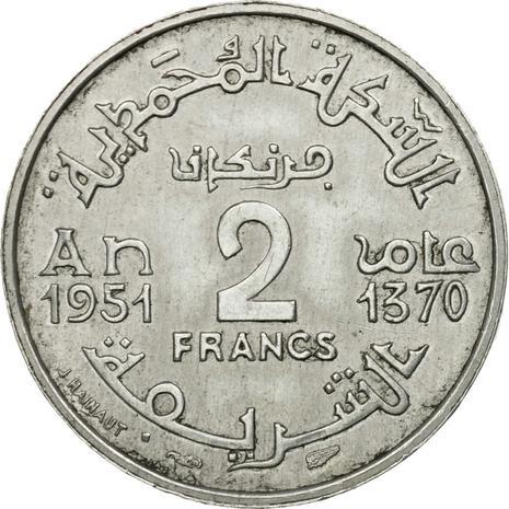 Letras no verso: السكة المحمدية فرنكان 2 FRANCS An 1951 1370 عام الشريفة J.HAINAUT