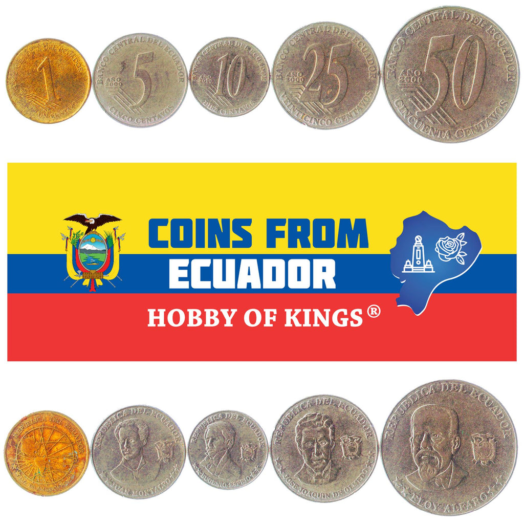 Набор из 5 монет, изготовленных в Эквадоре (Республика Эквадор, República del Ecuador). Эквадорские монеты выбраны из следующих периодов: Republica Del Ecuador 2000 - 2023 (2000 - 2003).