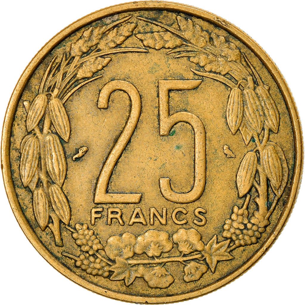 25 Francs Cfa coin from Central African States (Central Africa). The coin was circulated in 1970 - 1972 and will be picked randomly. Various grades from Good to Very fine. A photo is for advertising purposes only. The coin may have scratches, dirt, or damage from oxidation.