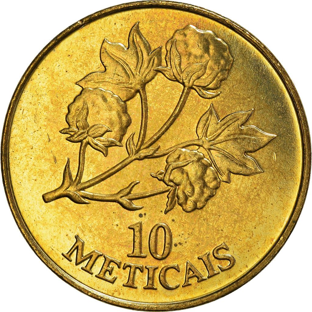 10 Meticais coin from Mozambique (Republic of Mozambique, República de Moçambique). The coin was circulated in 1994 and will be picked randomly. Various grades from Good to Very fine. A photo is for advertising purposes only. The coin may have scratches, dirt, or damage from oxidation.
