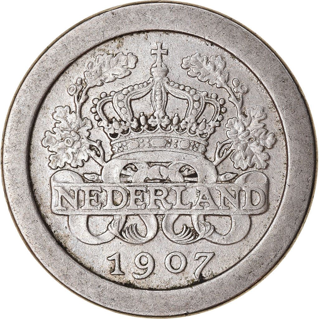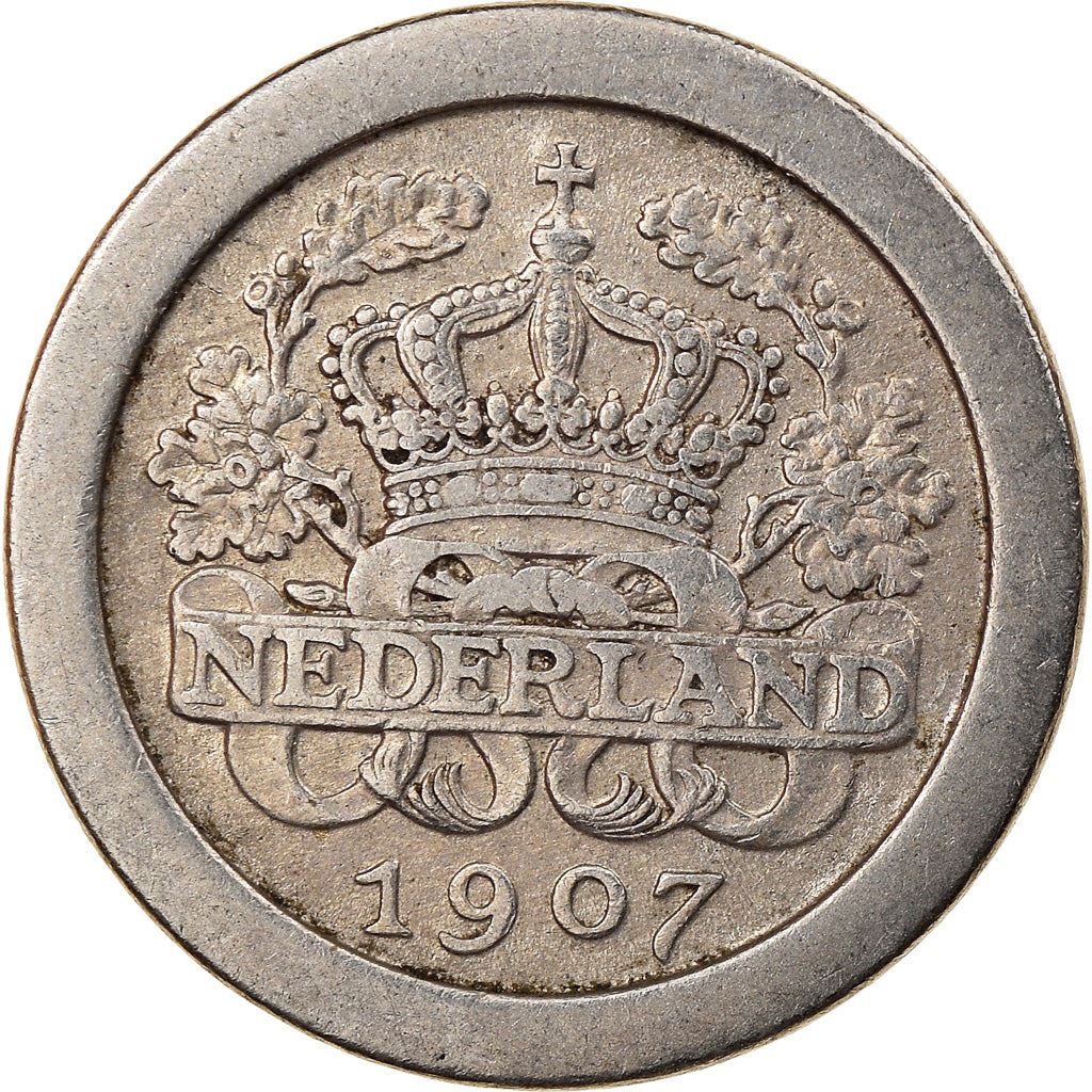 5 Cents coin from Netherlands (Netherlands, Nederland). The coin was circulated in 1907 - 1909 and will be picked randomly. Various grades from Good to Very fine. A photo is for advertising purposes only. The coin may have scratches, dirt, or damage from oxidation.