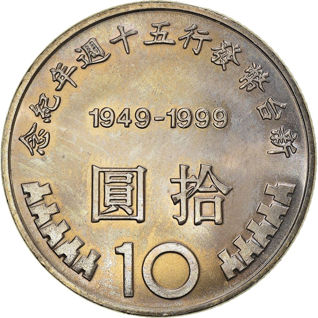 Reverse lettering: 念紀年週十五行發幣台新 1949-1999 圓拾 10