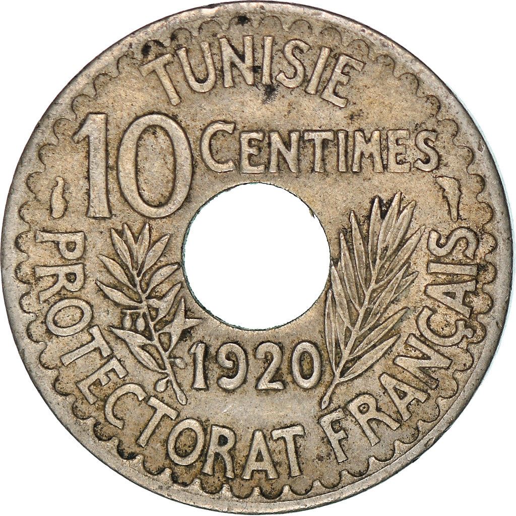 10 Centimes coin from Tunisia (al-Jumhūrīyah at-Tūnisīyah, الجمهورية التونسية). The coin was circulated in 1918 - 1920 and will be picked randomly. Various grades from Good to Very fine. A photo is for advertising purposes only. The coin may have scratches, dirt, or damage from oxidation.